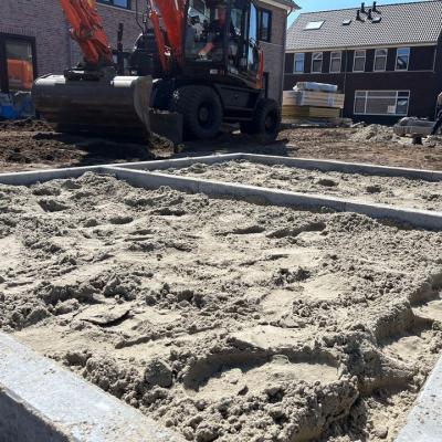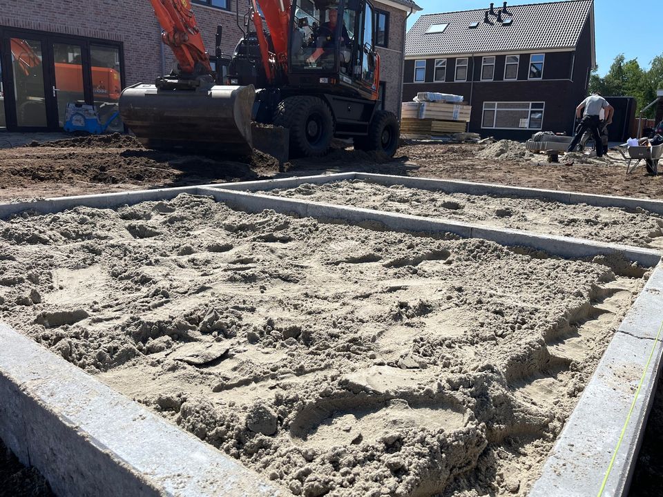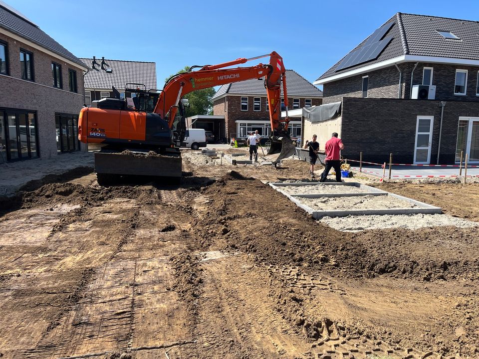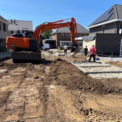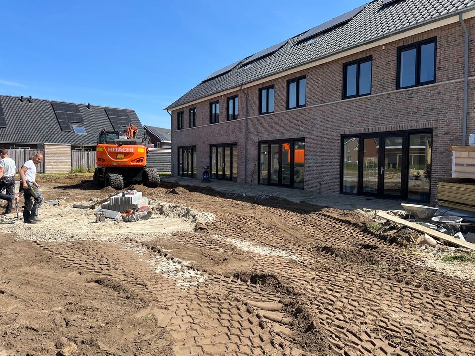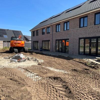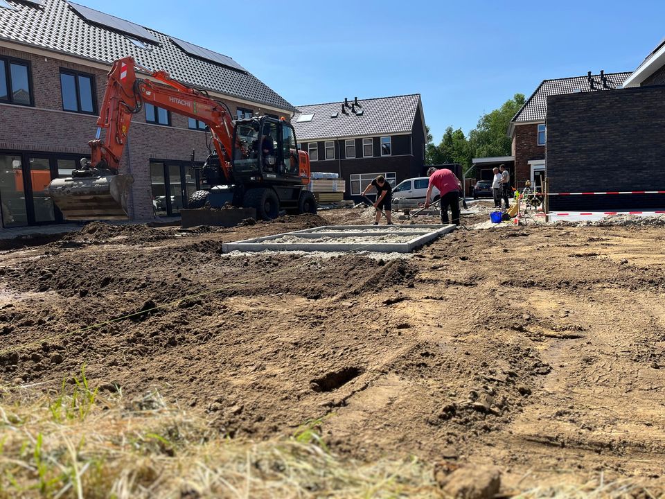 Zo werden de tuinen gereed gemaakt voor de bestrating en werden de funderingen van de tuinhuisjes vakkundig waterpas gelegd, zodat ook deze konden worden geplaatst. Later deze week volgt ook de bestrating aan de achterzijde en voorzijde van de woningen.