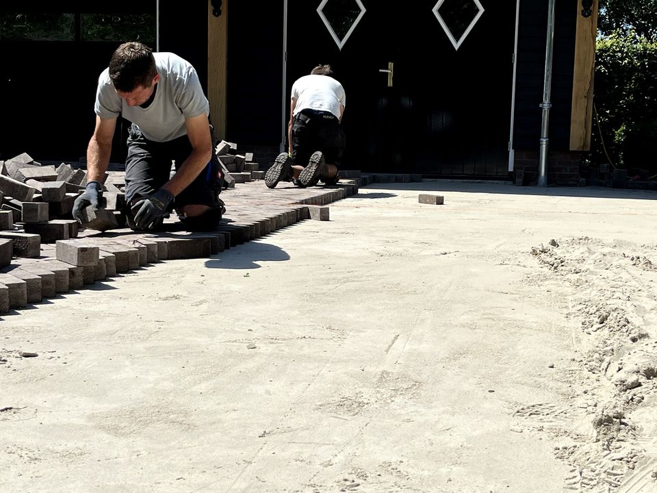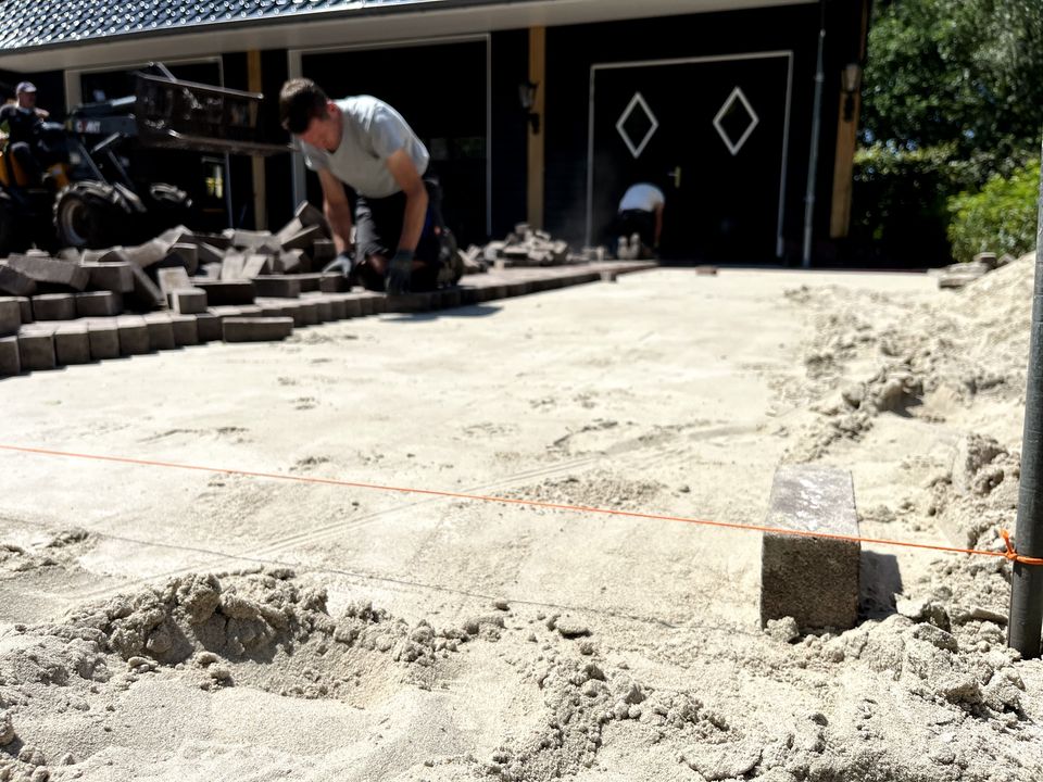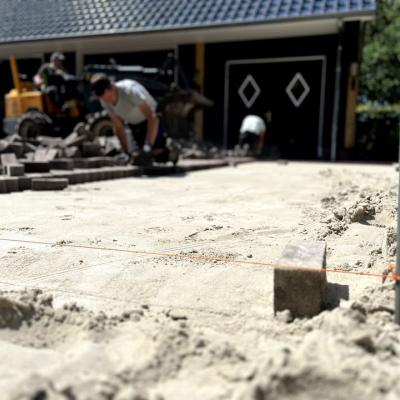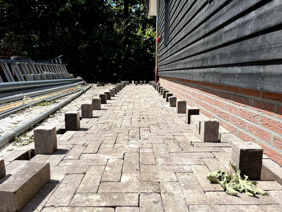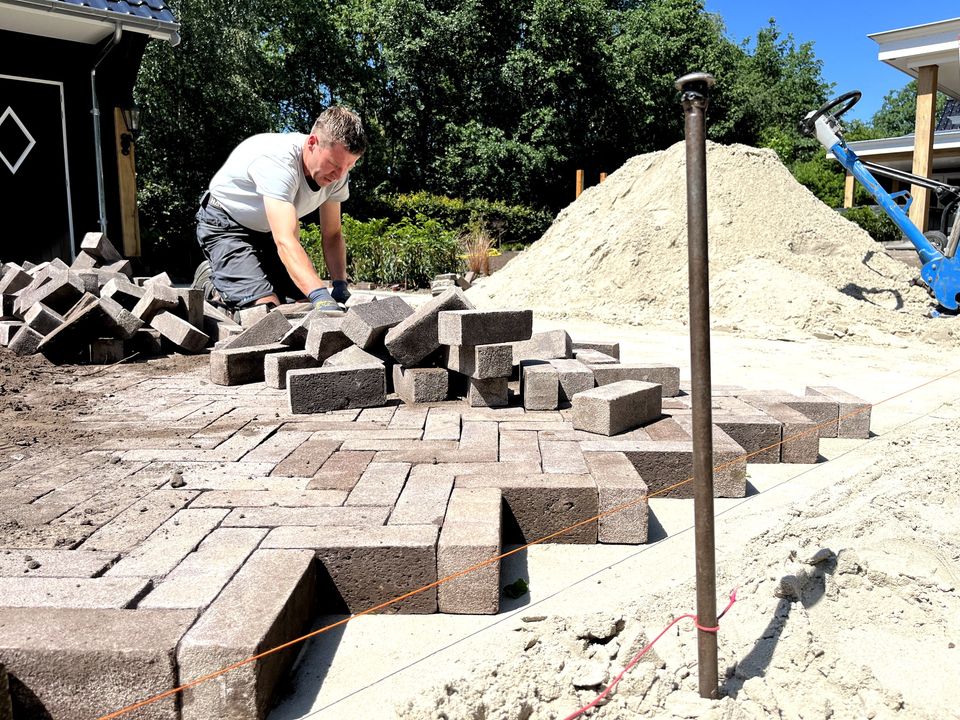 Na de aanleg van de beregeningsinstallatie en (een deel van) de beplanting, was het tijd voor de bestrating van deze tuin. Onze collega's maakten heel wat meters in de brandende zon, maar het resultaat mag er dan ook zijn!