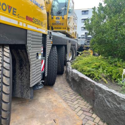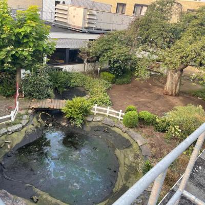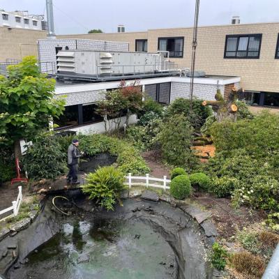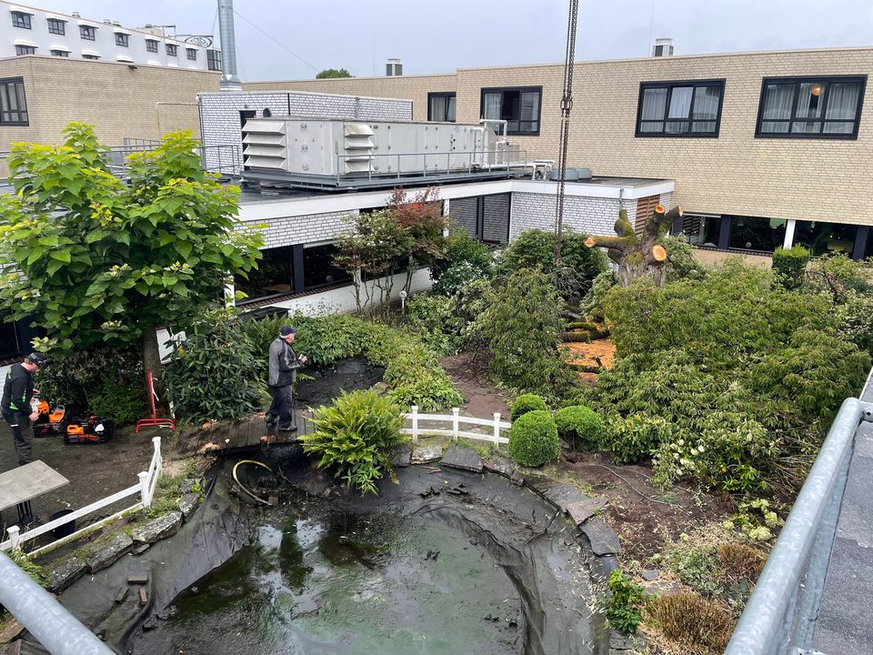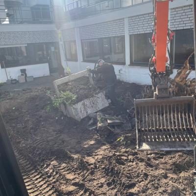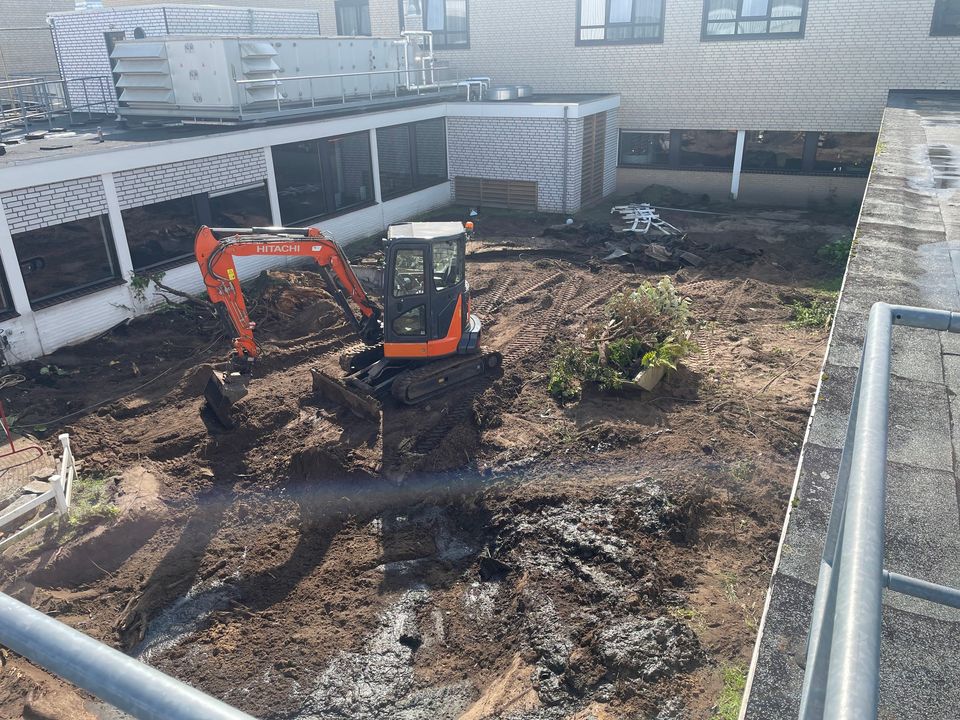 We hebben een oorspronkelijke binnentuin tot op ongeveer 170cm ontgraven en daarna grondverbetering toegepast, waarbij er in totaal 50 cm schoon zand is opgebracht.Vanwege de lastige bereikbaarheid is in totaal een kleine 600kuub(!) grond in een 1,5 kuub bak geschept.