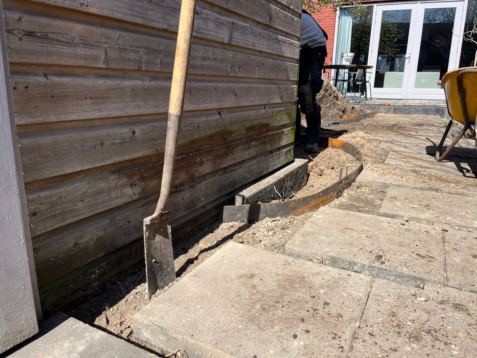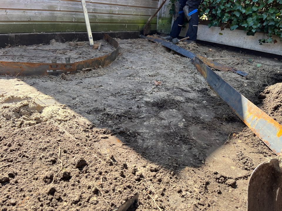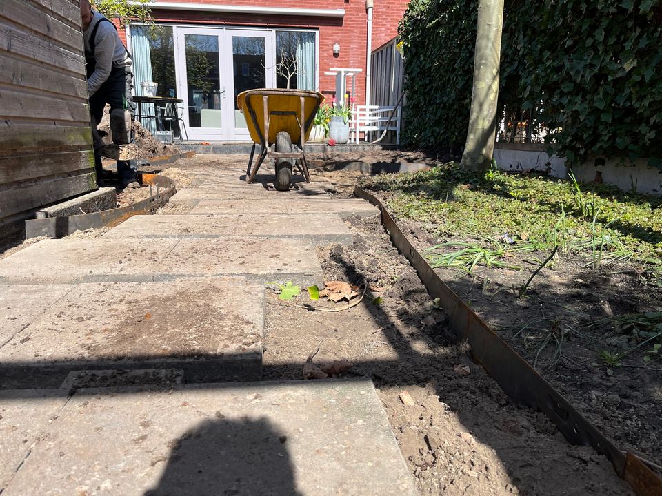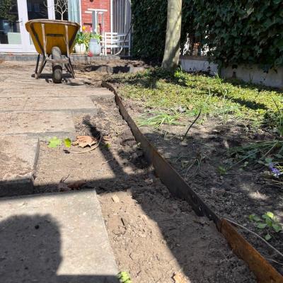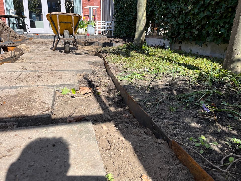 Zo mochten wij aan de rand van de binnenstad in Enschede een fraaie tuin met speelse lijnen aanleggen. Het werk is nog lang niet klaar, maar de eerste contouren van Cortenstaal worden al zichtbaar. Uiteraard volgen de foto's van het eindresultaat spoedig....😉