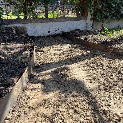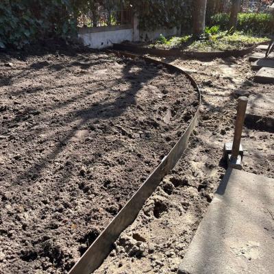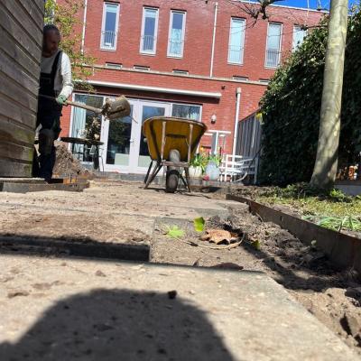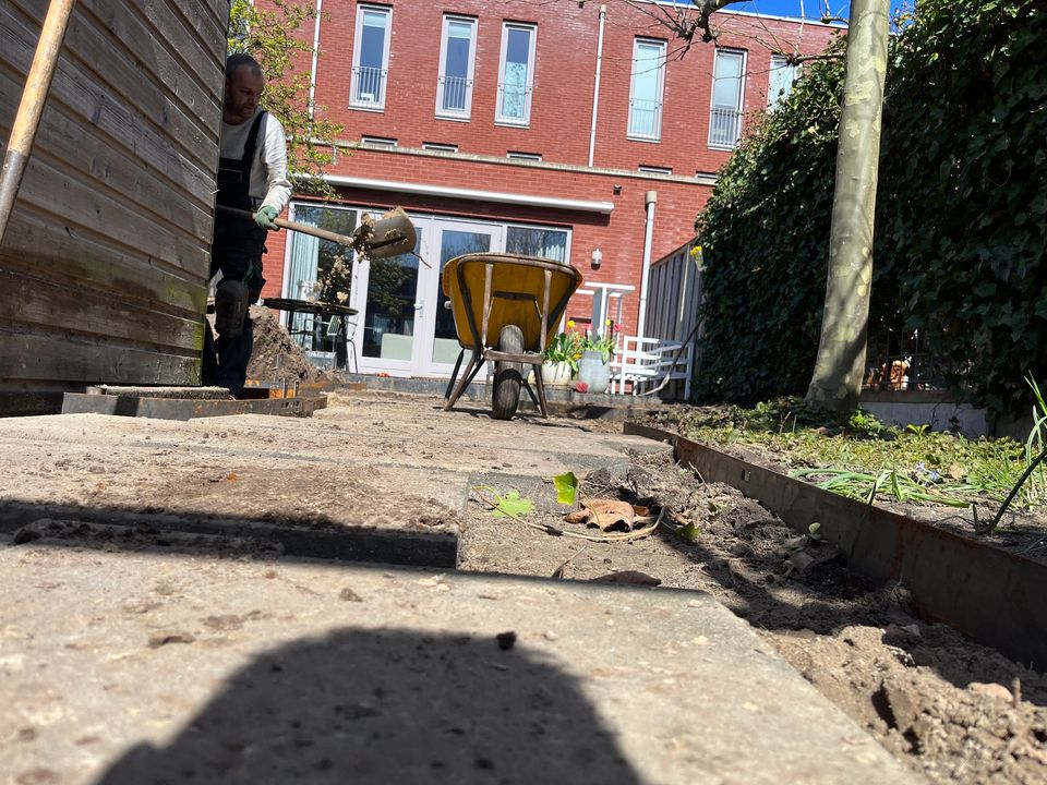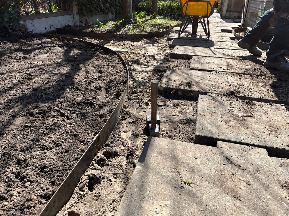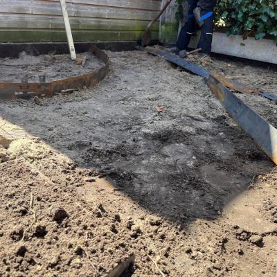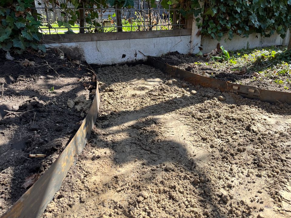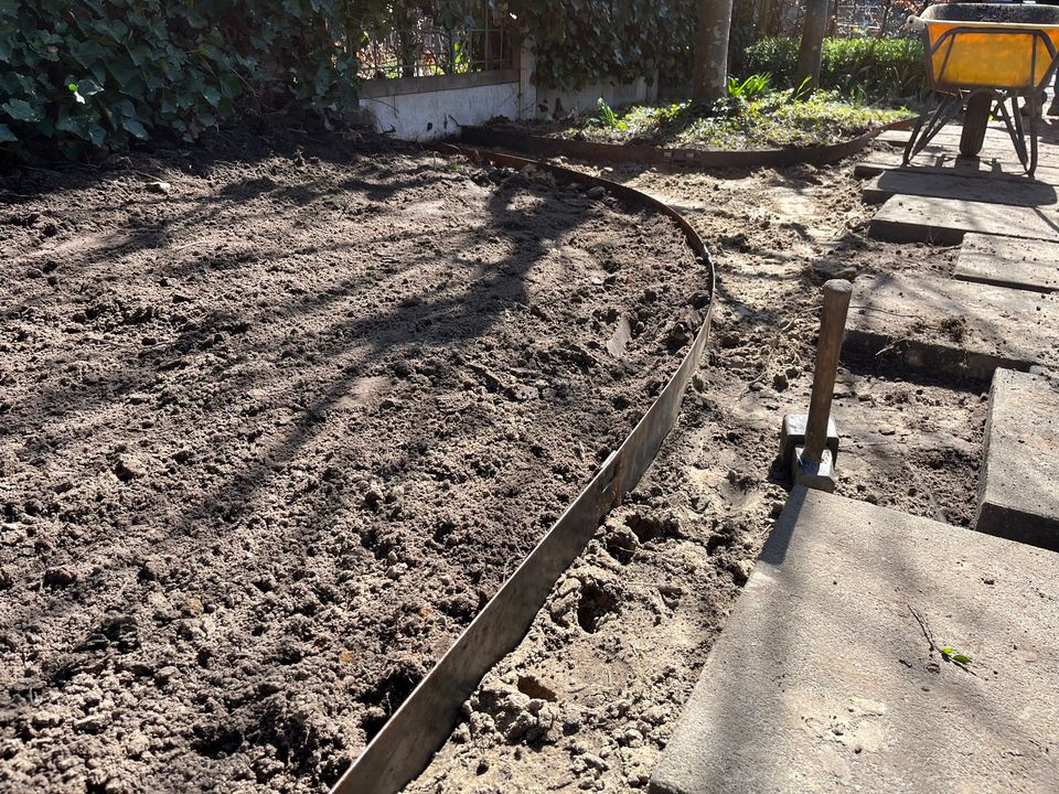 Zo mochten wij aan de rand van de binnenstad in Enschede een fraaie tuin met speelse lijnen aanleggen. Het werk is nog lang niet klaar, maar de eerste contouren van Cortenstaal worden al zichtbaar. Uiteraard volgen de foto's van het eindresultaat spoedig....😉